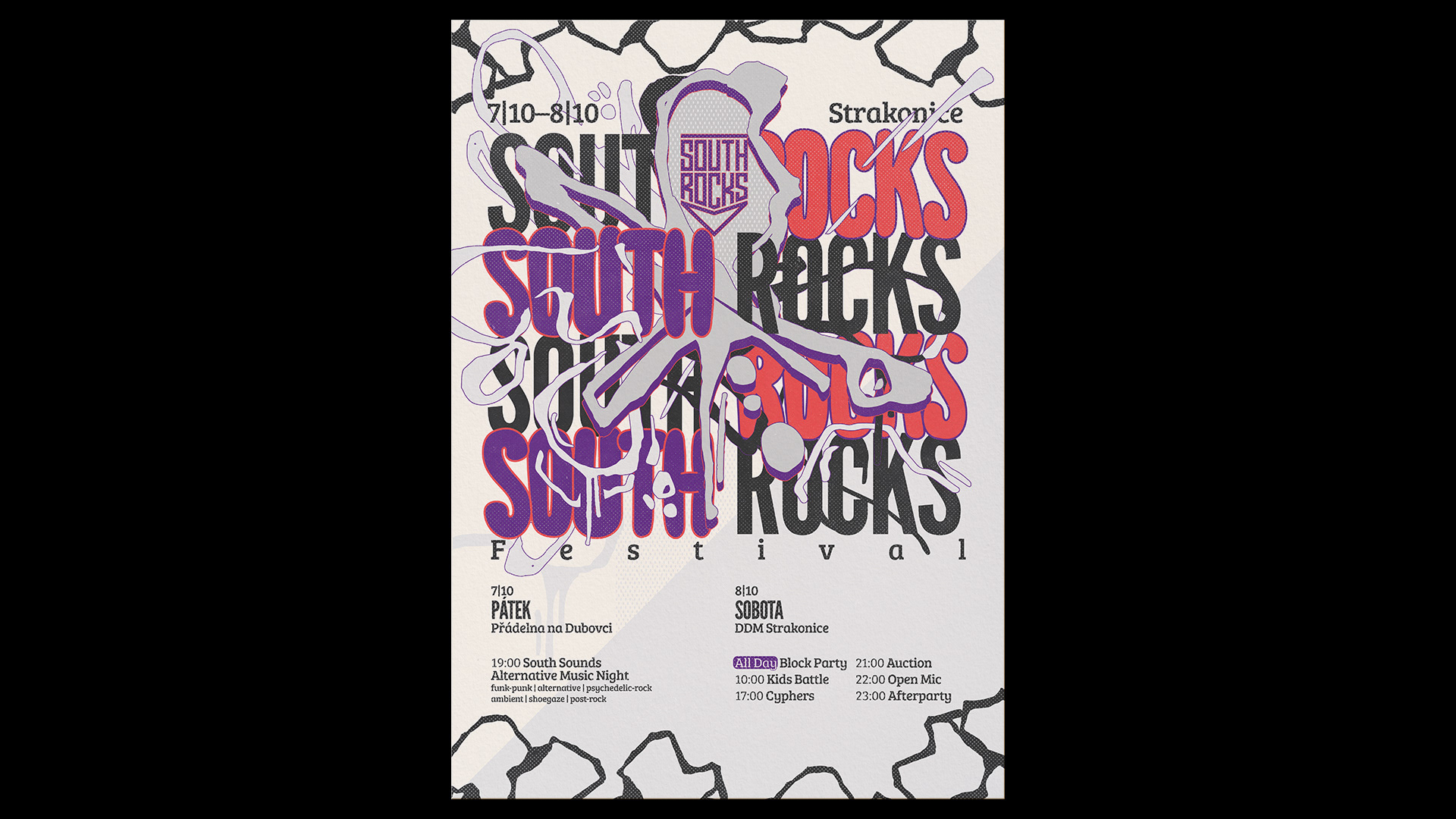 Printed poster for mini hiphop festival and dance event with followup series of digital posters for each major sub-event of the lineup. Formed around graffiti-like illustrations and bold typography with vintage comics feeling.